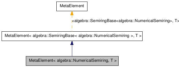 Inheritance diagram for MetaElement< algebra::NumericalSemiring, T >: