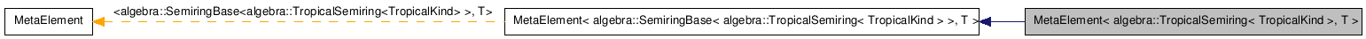 Inheritance diagram for MetaElement< algebra::TropicalSemiring< TropicalKind >, T >: